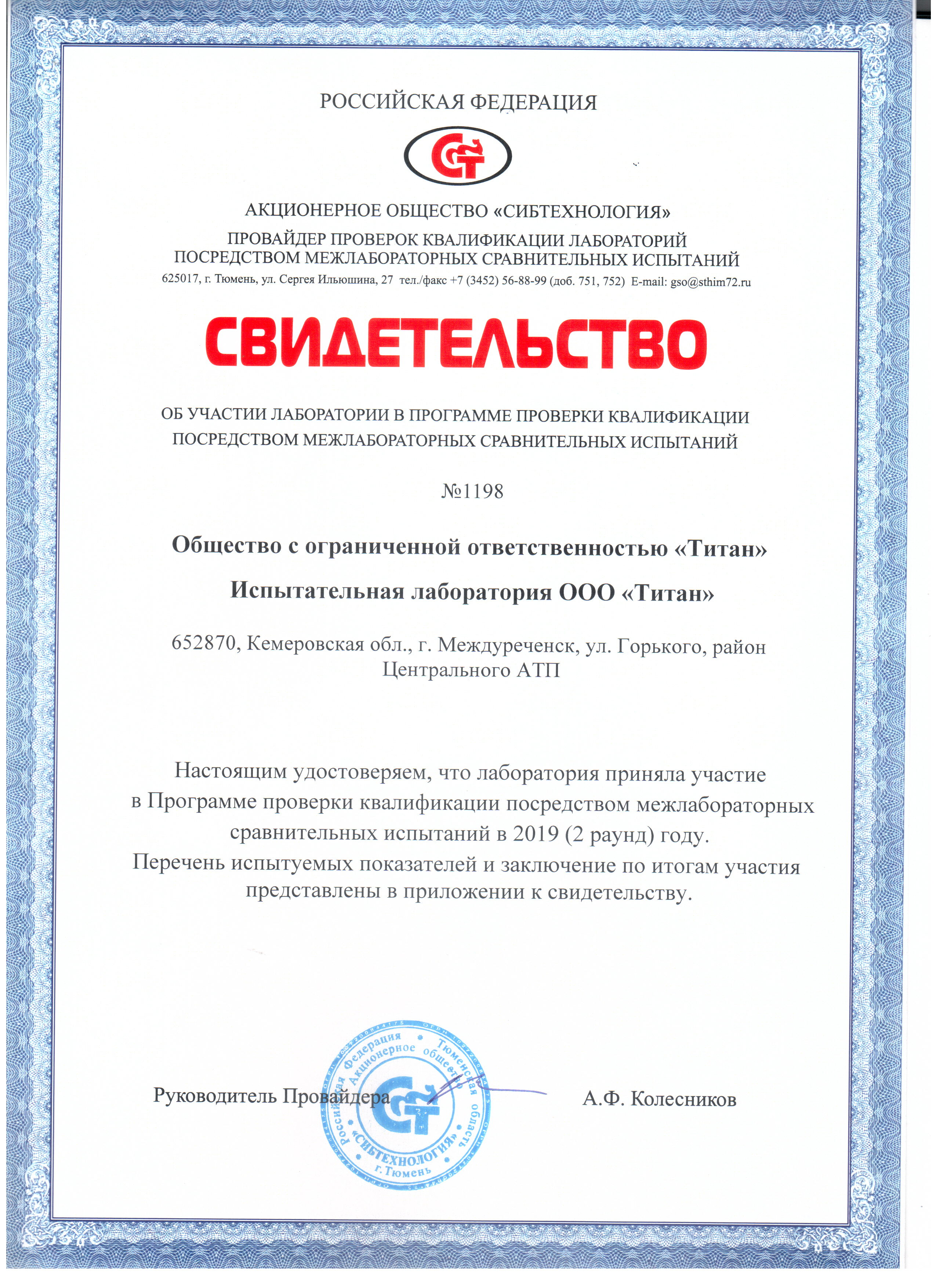 Испытательная лаборатория: 652870, Кемеровская область, г. Междуреченск, проезд Горького 19а